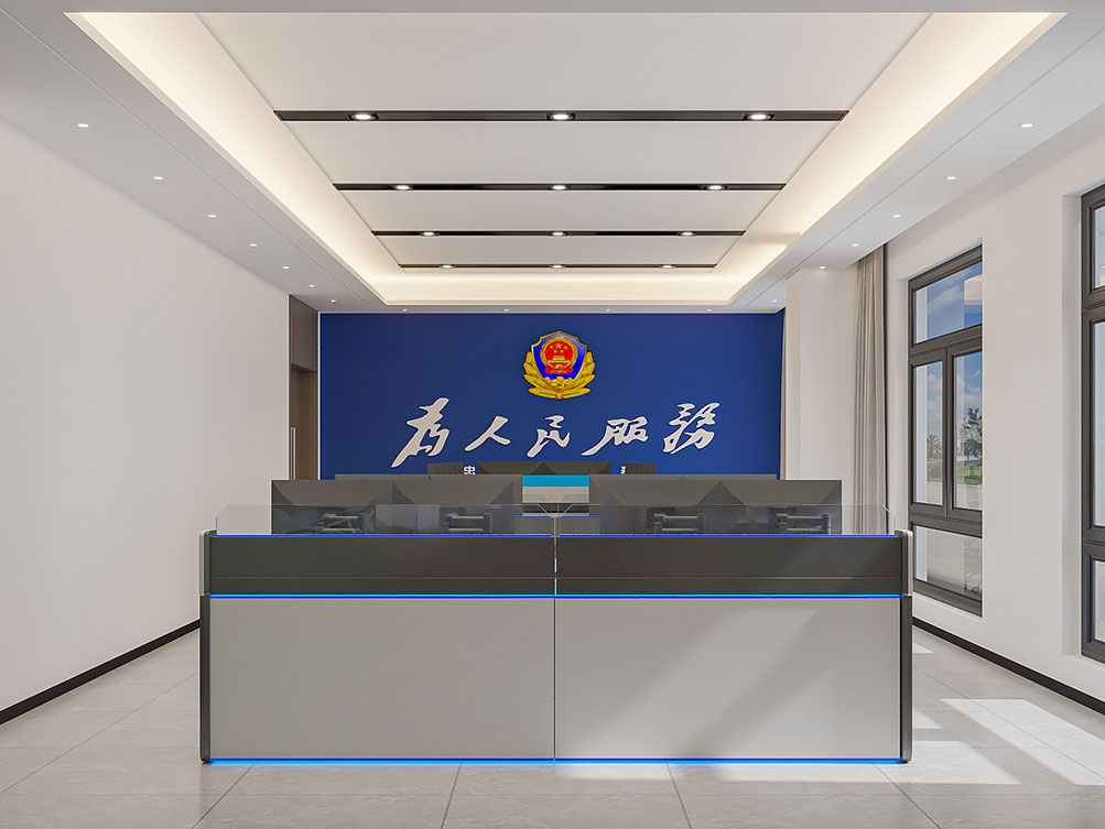 設計理念: 作為職能類辦公室裝修的標桿案例,曹縣公安局指揮中心以簡潔大氣的現代風格為主調:深藍主墻面搭配為人民服務標識,強化職能屬性;一體化操作臺 + 多屏設備適配指揮調度需求,淺灰地面與嵌入式燈光保障空間通透明亮,兼具專業性與實用性,是職能類辦公室裝修中功能優先 + 形象適配的典型呈現。